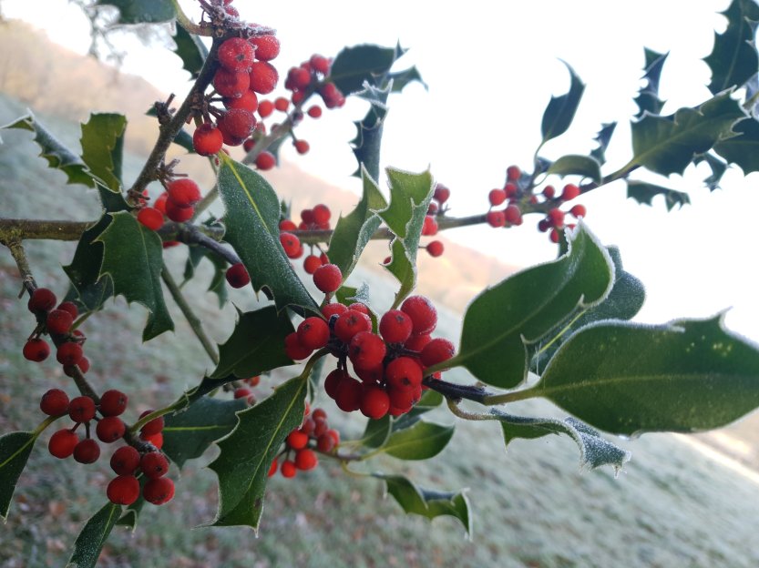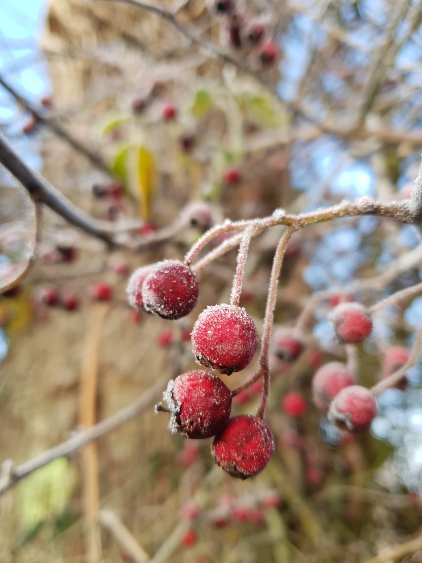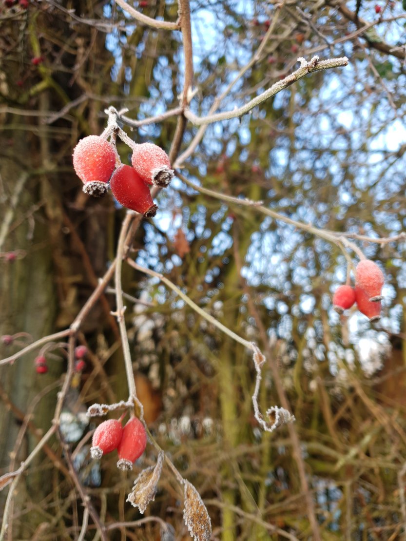 Forced to make a detour from our planned route due to a dog that’s not the most friendly, we set off down a cutting. Jack Frost had been busy along here, the red berries looked like they had been dusted with icing sugar and wouldn’t look out of place on top of a Christmas cake.