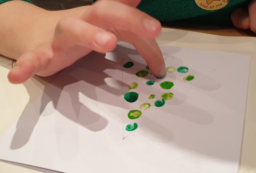 I set Little Miss to work on drawing some triangles and rectangles as a base for the Christmas tree, which in theory should have taken a couple of minutes but it appears my OCD tendencies have been inherited and they had to be perfect.