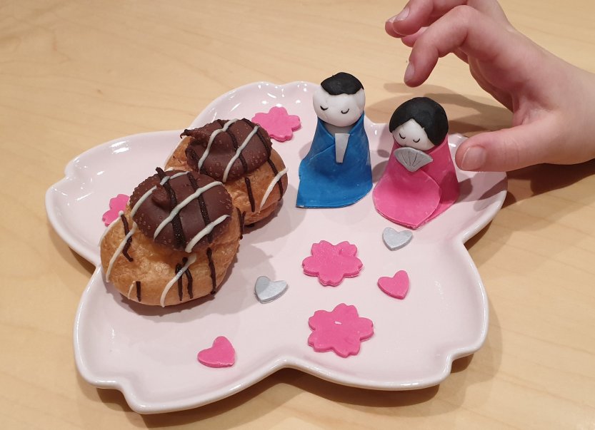 As it is not easy to purchase the traditional sweet treats such as hishi mochi (tri-coloured rice cakes) or ichigo daifuku (strawberries covered in sweet bean paste) in the UK, I like to put my twist on dessert for my little princess. This year I made some edible Hinaningyo to decorate her plate, of course she wanted to eat them but we limited her to just taking a nibble.