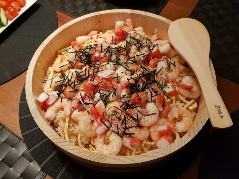 Chirashizushi, raw fish and vegetables served on sushi rice, is often served as a special meal. It is very pretty to look at and ingredients and presentation vary according to personal taste. Unfortunately, it’s not so easy to get ikura, salmon roe, which adds the vibrant orange to the dish but I use what I can and it is a hit when we have it in our house.
