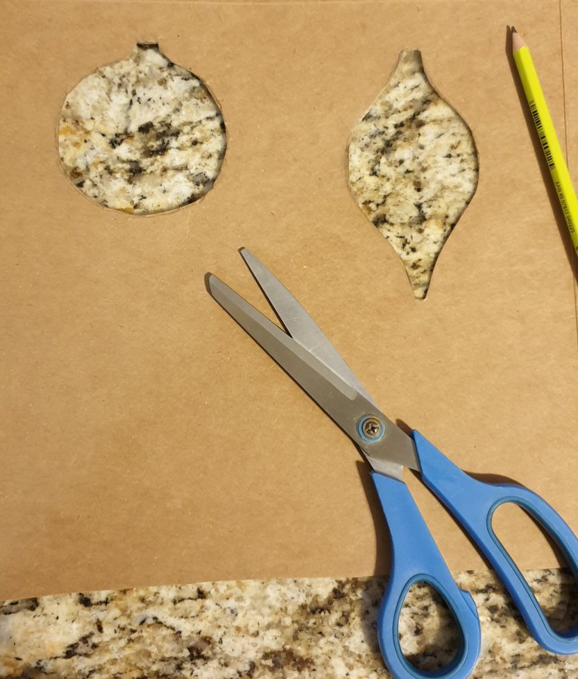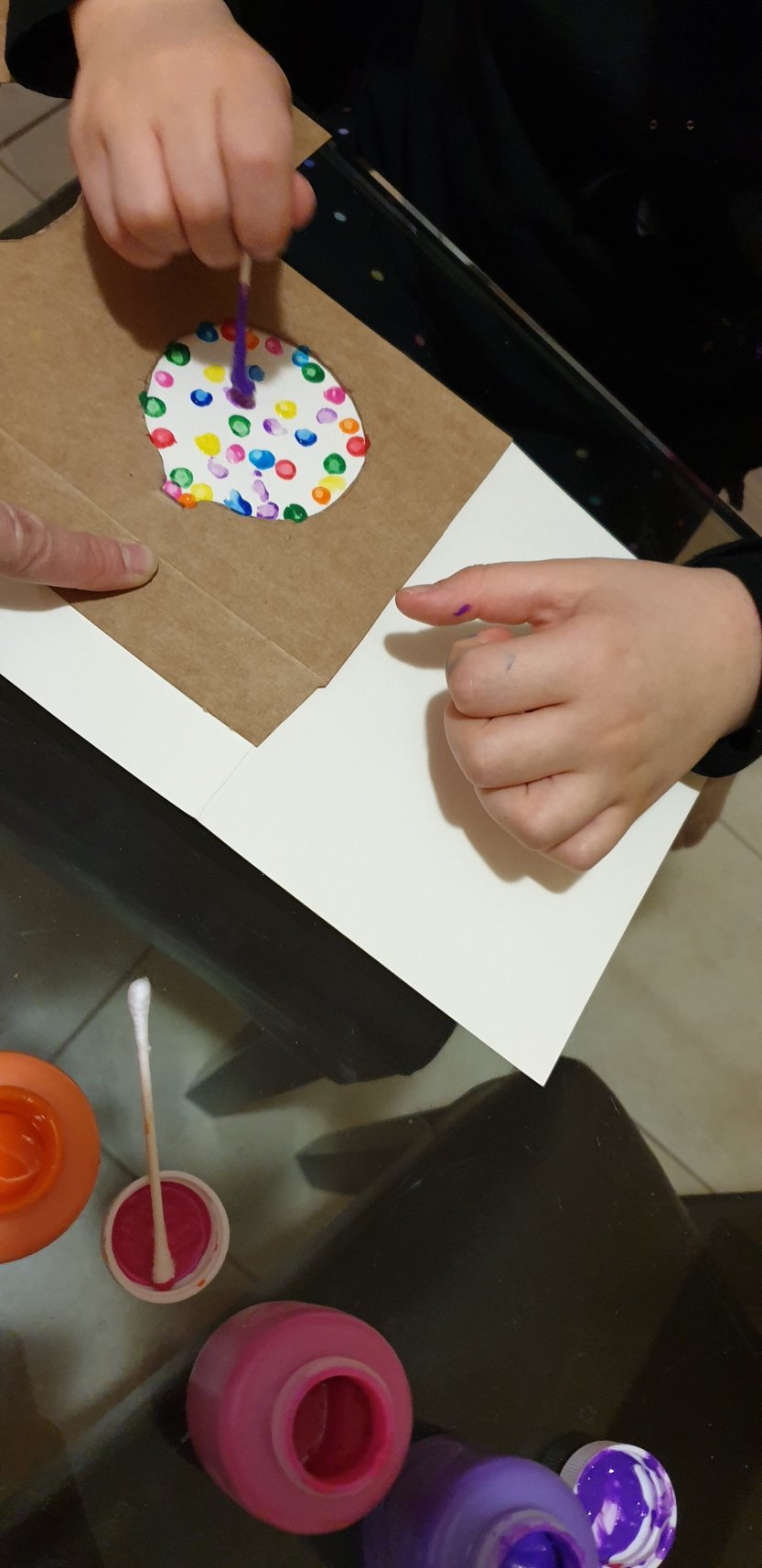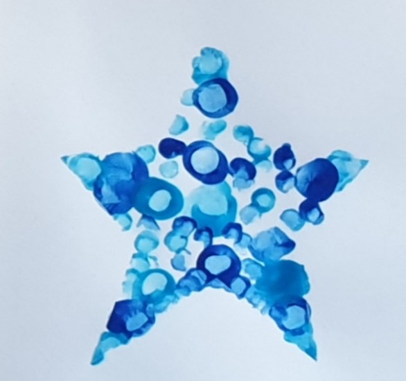 Little Miss opted to created some other festive shaped baubles and I made the stencils as instructed, which she filled using finger painting and cotton buds as our painting supplies have yet to be unpacked since relocating.